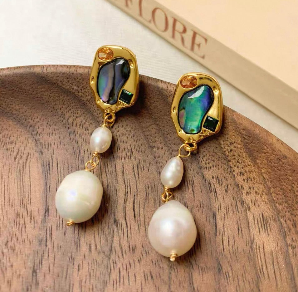Gold plated drop pearl earrings with sweet water pearl and stones design.