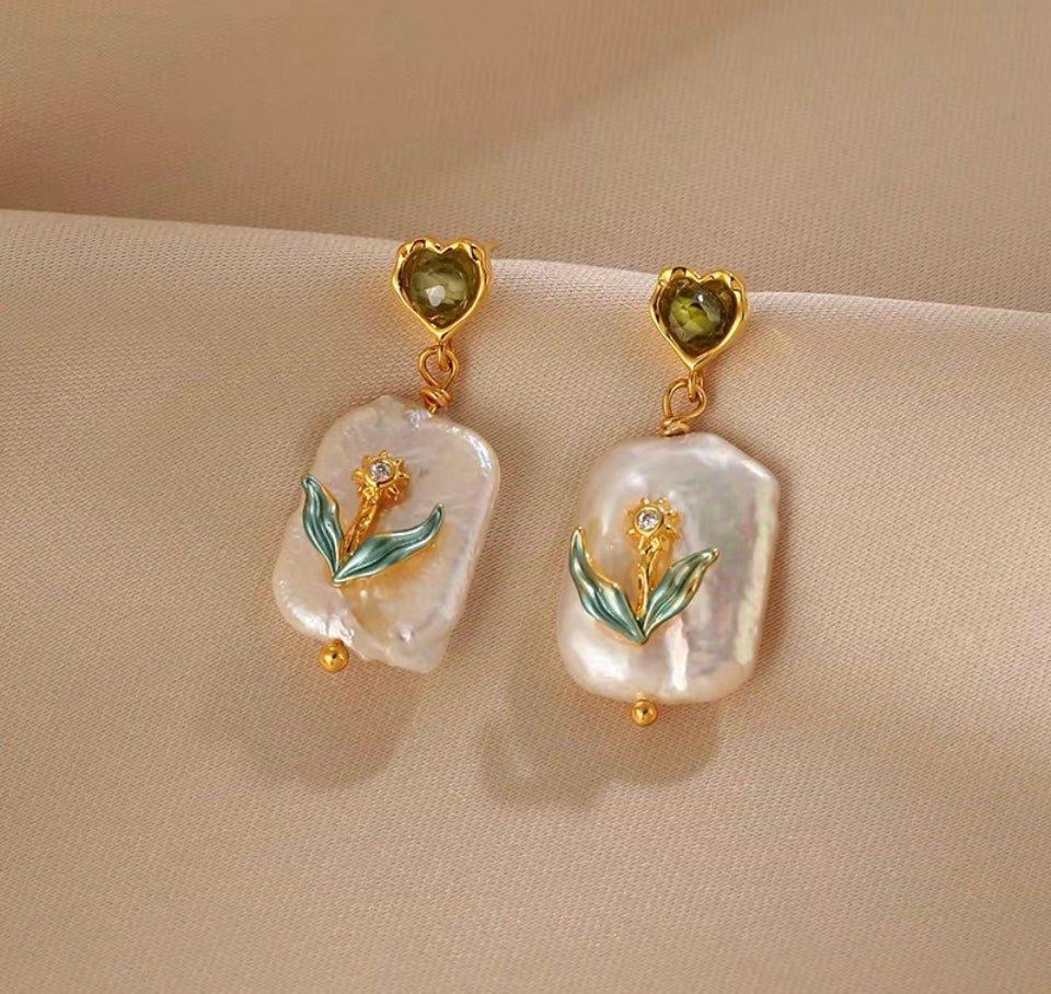 Gold plated rectangle sweet water pearl with delicate flower with stone earring.